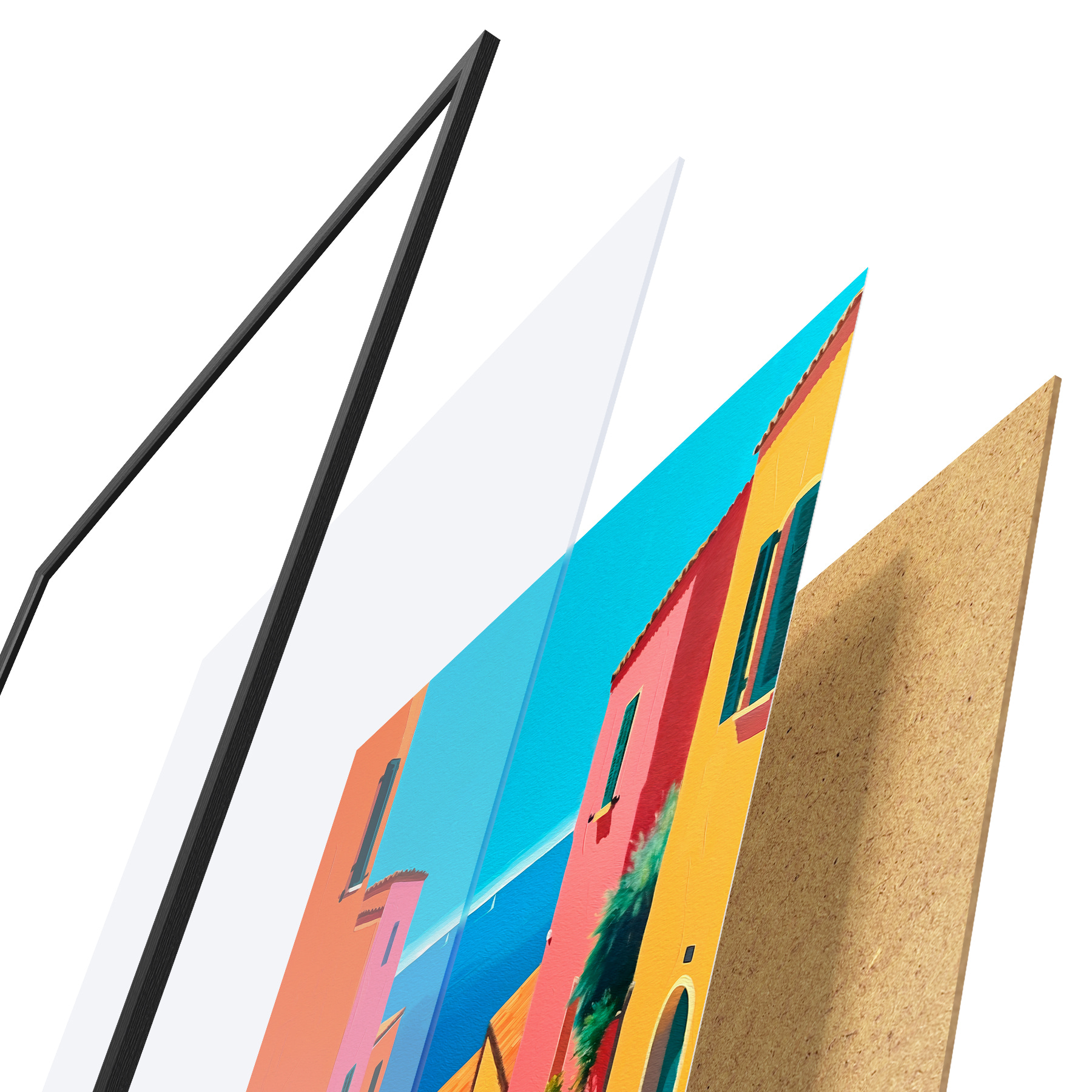 Le poster se compose d'un cadre, d'un plexiglas, d'une image imprimée et d'un support en aggloméré. Le poster peut être immédiatement accroché au mur grâce aux fixations au dos.