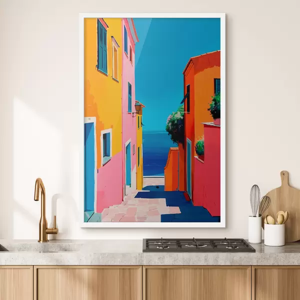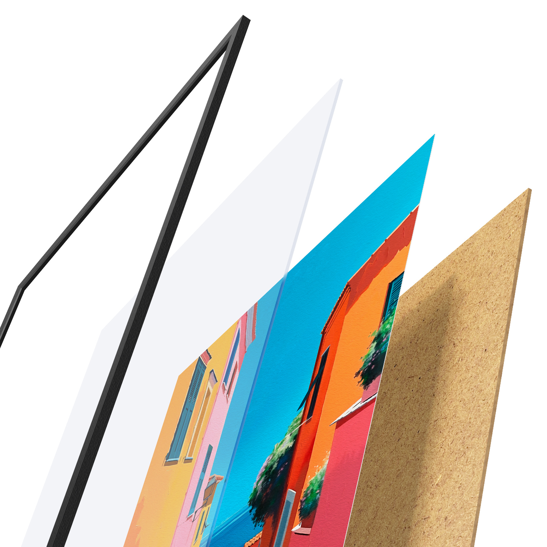 Le poster se compose d'un cadre, d'un plexiglas, d'une image imprimée et d'un support en aggloméré. Le poster peut être immédiatement accroché au mur grâce aux fixations au dos.