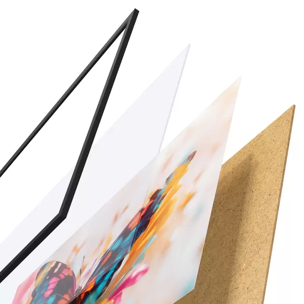 Le poster se compose d'un cadre, d'un plexiglas, d'une image imprimée et d'un support en aggloméré. Le poster peut être immédiatement accroché au mur grâce aux fixations au dos.
