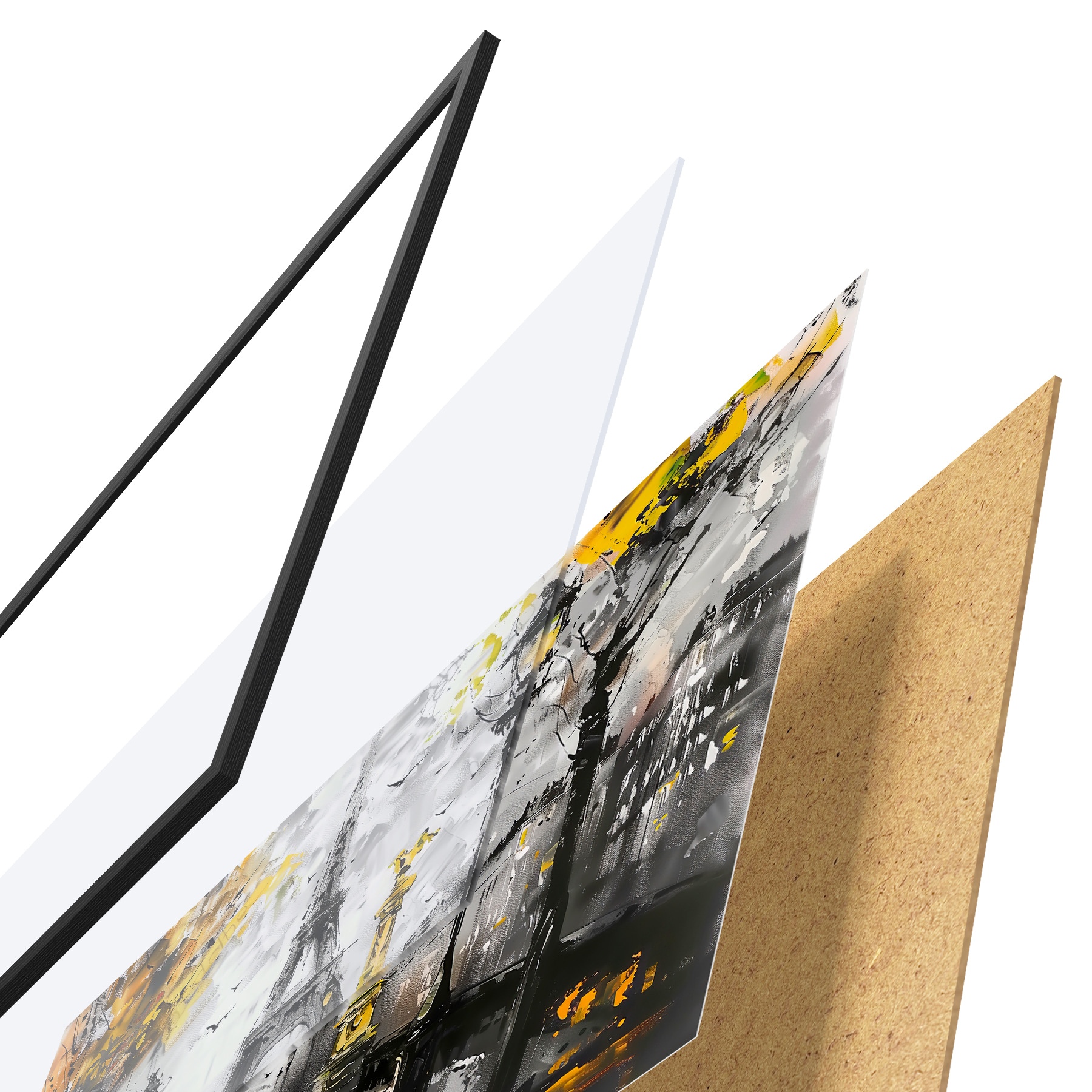 Le poster se compose d'un cadre, d'un plexiglas, d'une image imprimée et d'un support en aggloméré. Le poster peut être immédiatement accroché au mur grâce aux fixations au dos.