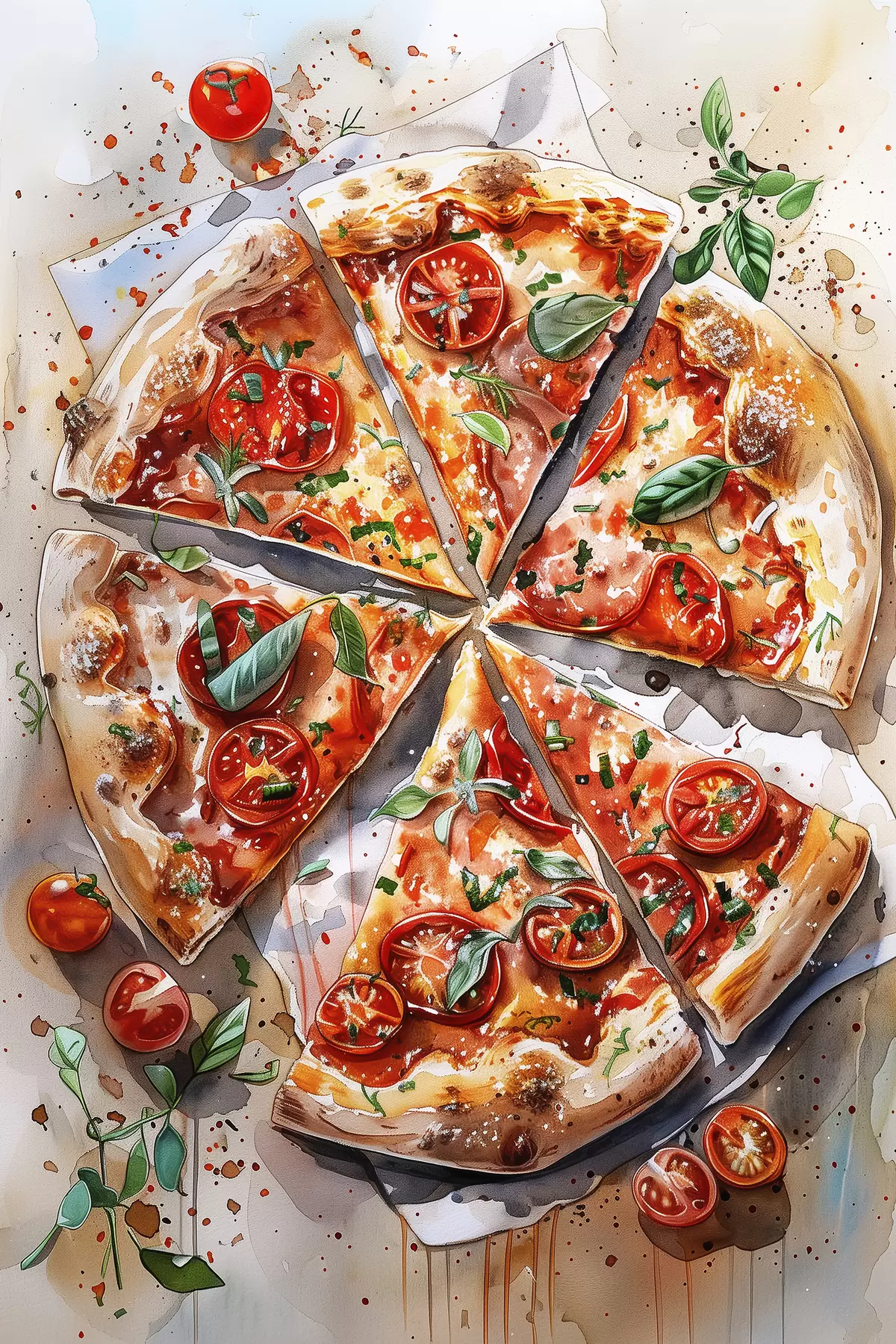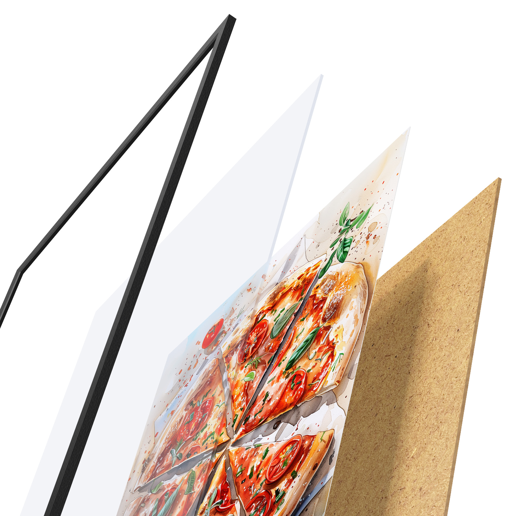 Affiche Pizza aquarelle, délicieuse, tomates et fromage, art culinaire, table en bois f39704