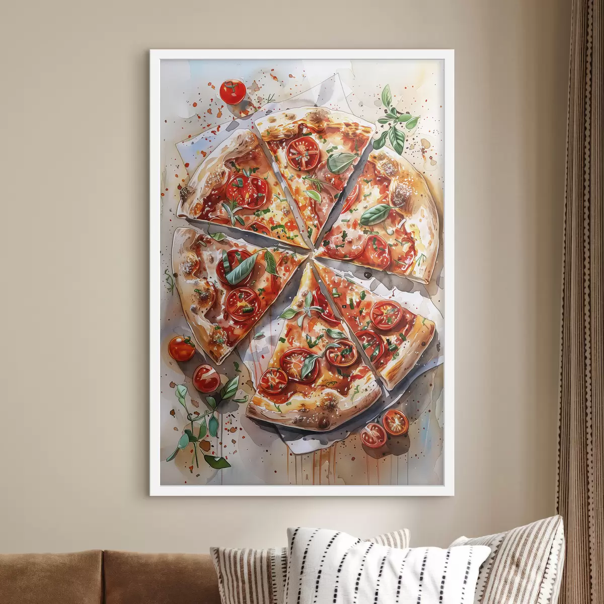 Affiche Pizza aquarelle, délicieuse, tomates et fromage, art culinaire, table en bois Non f39704