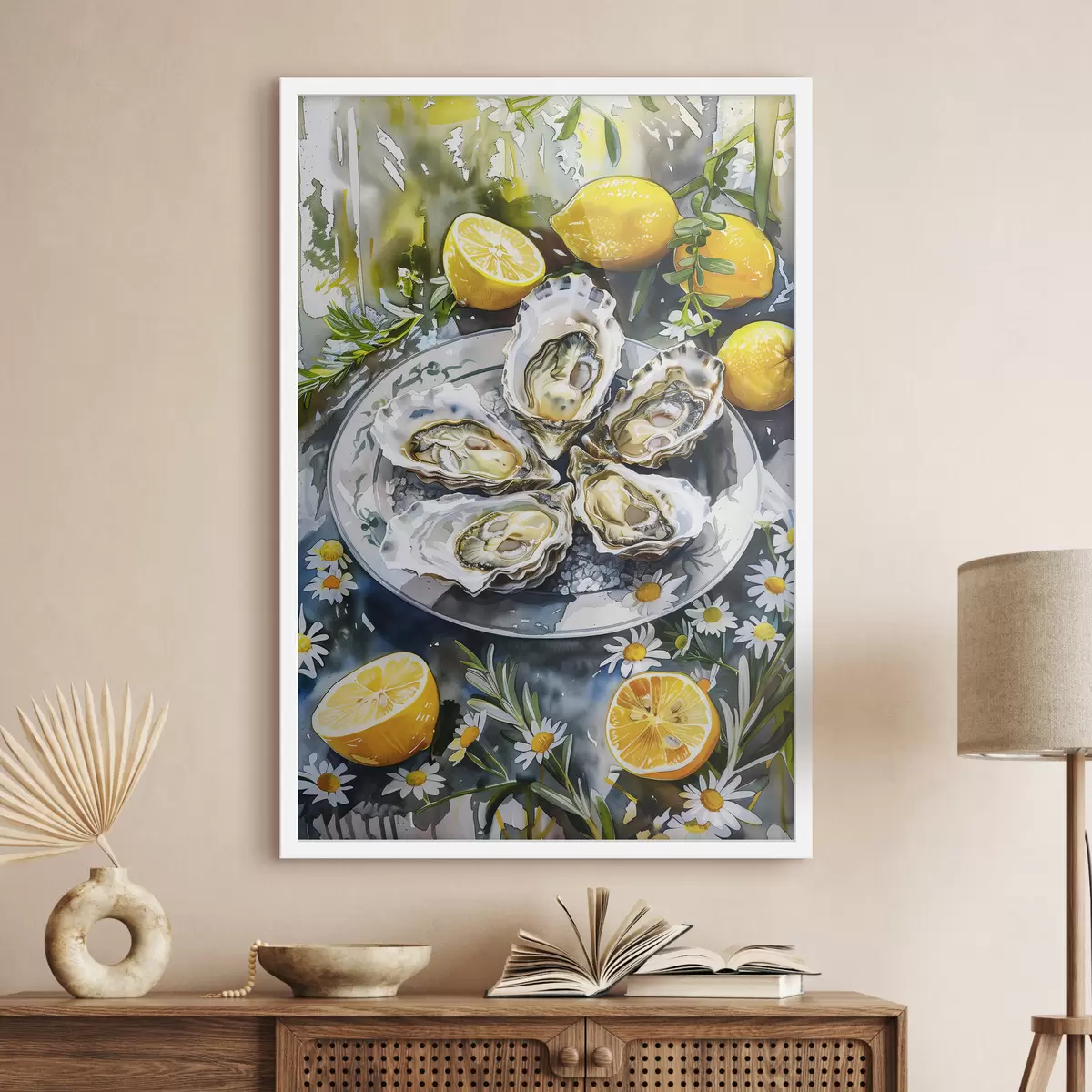 Affiche Huîtres élégantes dans l'assiette, citrons et fleurs, couleurs estivales, méditerranéennes f39710