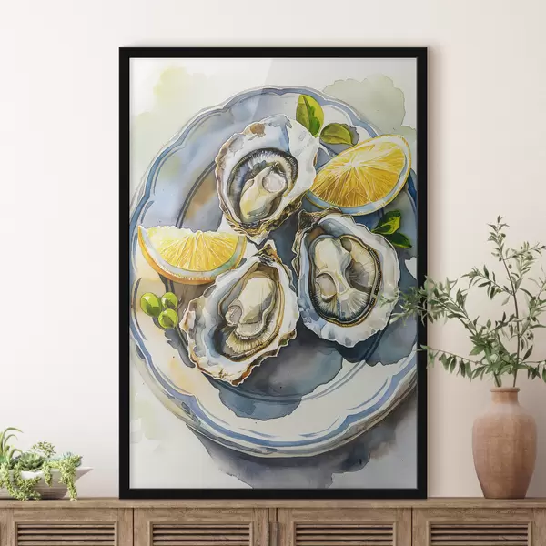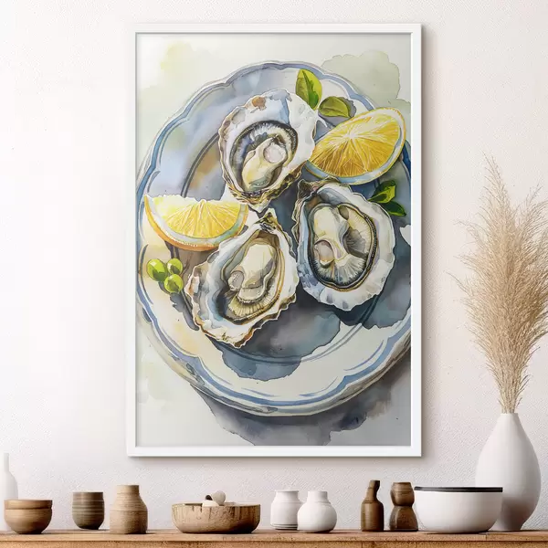 Affiche Huîtres élégantes dans l'assiette, aquarelle, citrons, couleurs naturelles, méditerranéennes f39711