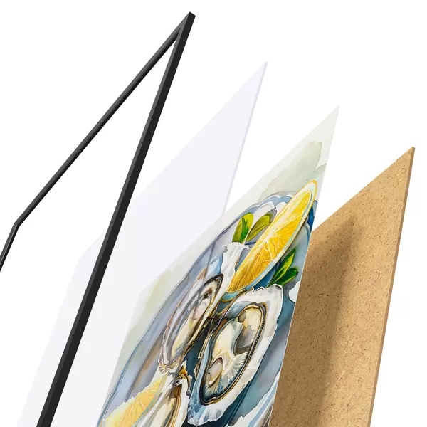 Le poster se compose d'un cadre, d'un plexiglas, d'une image imprimée et d'un support en aggloméré. Le poster peut être immédiatement accroché au mur grâce aux fixations au dos.