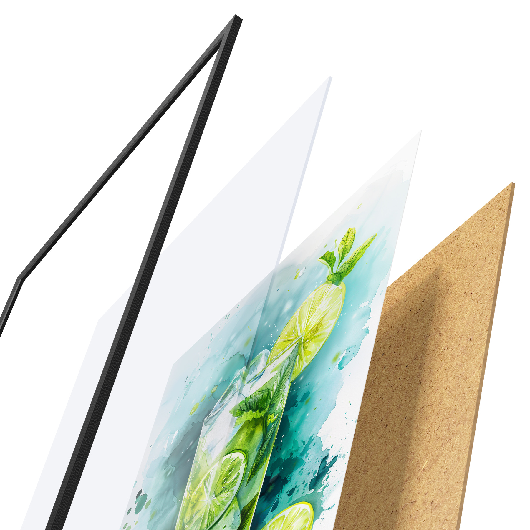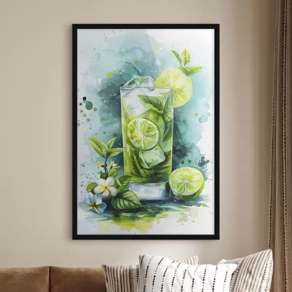 Affiche Cocktail d'été aquarelle, mojito, citron vert et menthe, fleurs, couleurs vertes Non f39712