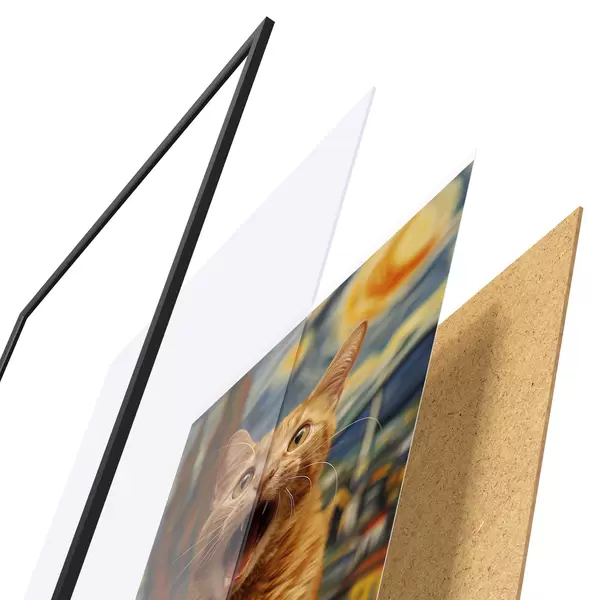 Le poster se compose d'un cadre, d'un plexiglas, d'une image imprimée et d'un support en aggloméré. Le poster peut être immédiatement accroché au mur grâce aux fixations au dos.