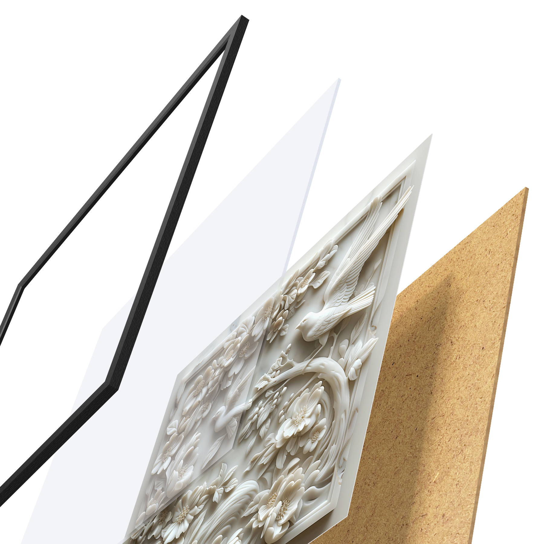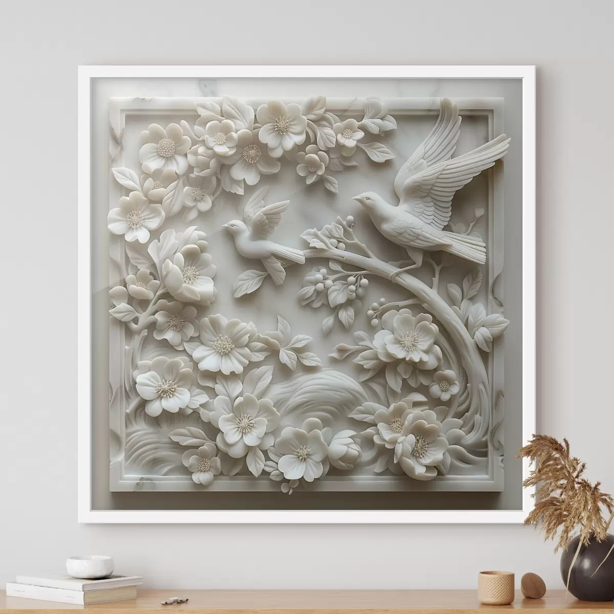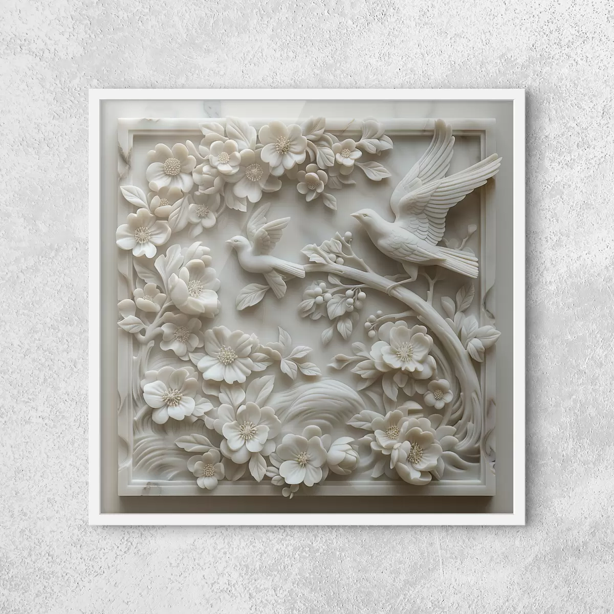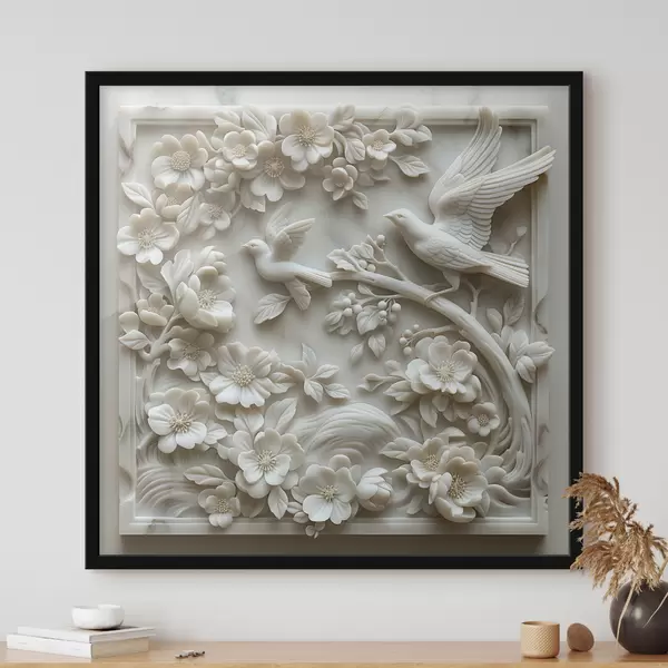 Affiche Un jardin de marbre blanc avec des reliefs d'oiseaux et de fleurs Non f39728