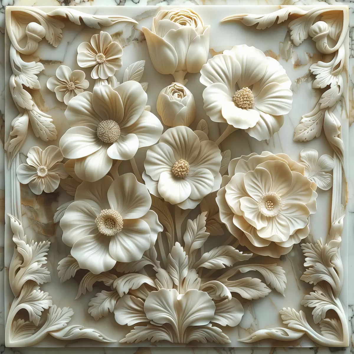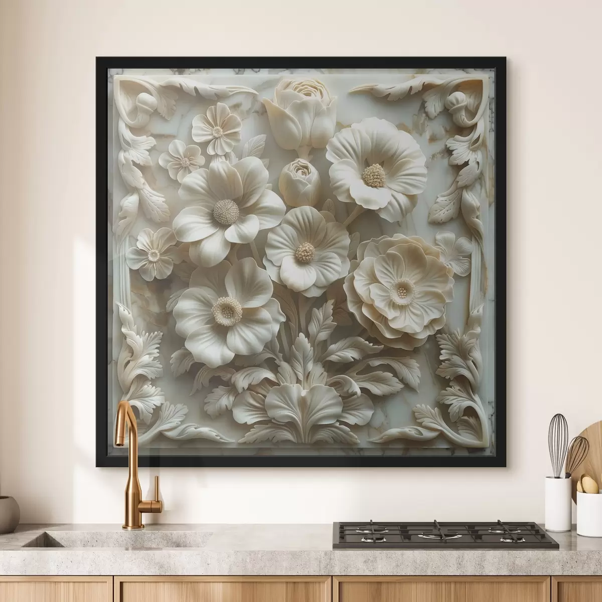 Affiche fleurs en bas-relief blanches en 3D sur fond de marbre avec un cadre f39739