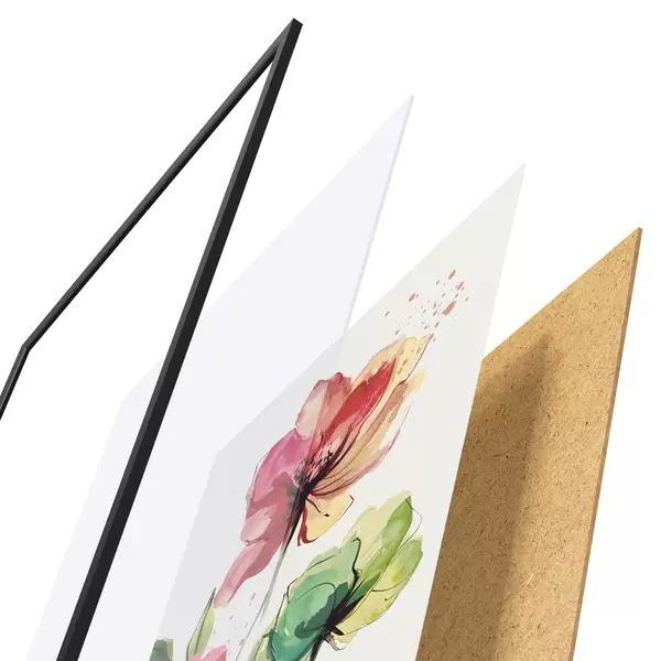 Le poster se compose d'un cadre, d'un plexiglas, d'une image imprimée et d'un support en aggloméré. Le poster peut être immédiatement accroché au mur grâce aux fixations au dos.