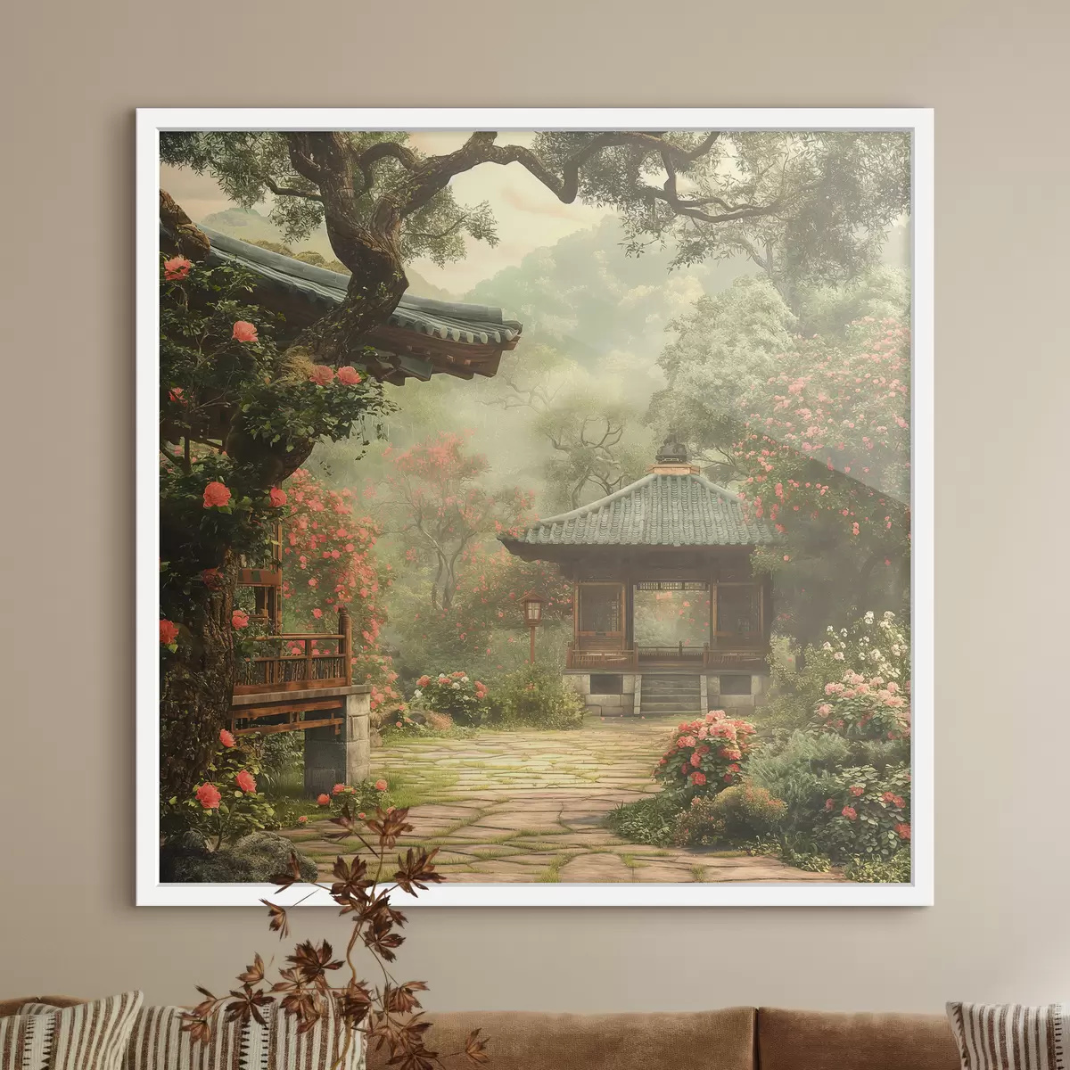 Affiche Parc japonais avec arbres et fleurs en fleurs, forêt, maison en bois Non f39773