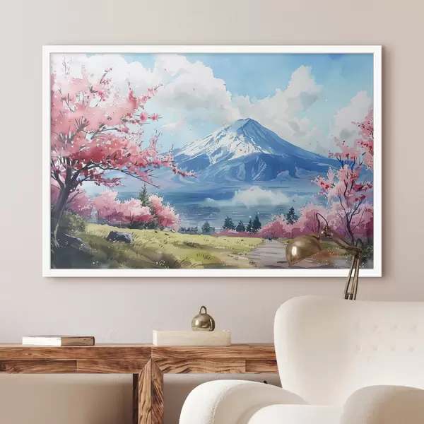 Affiche Paysage de montagne Fuji, nature fleurie au printemps, cerisiers, japonais f39777