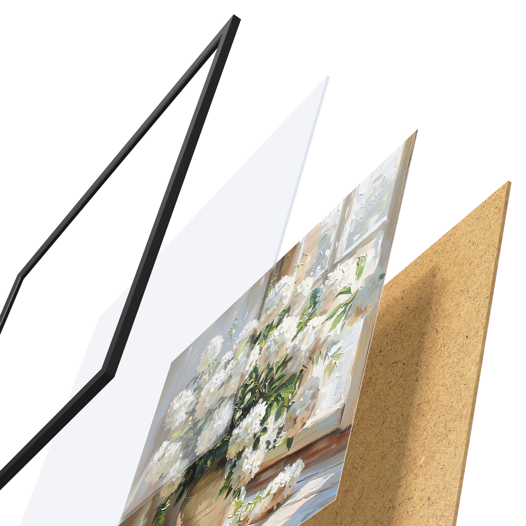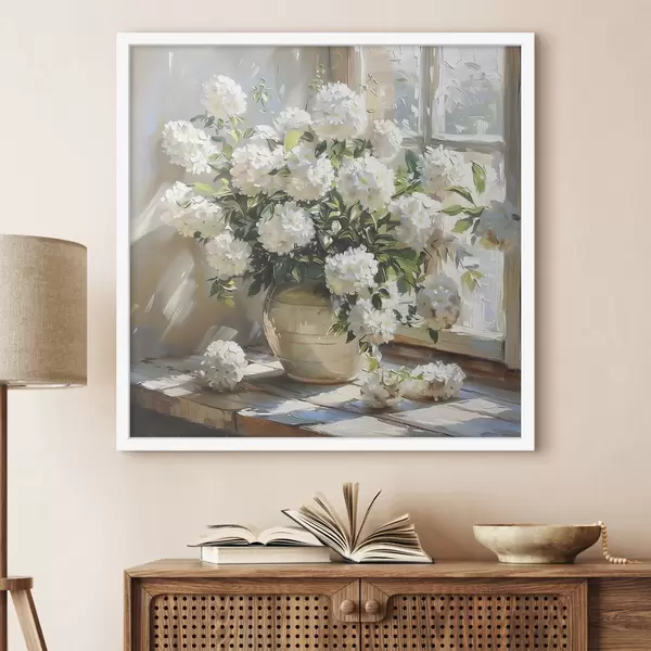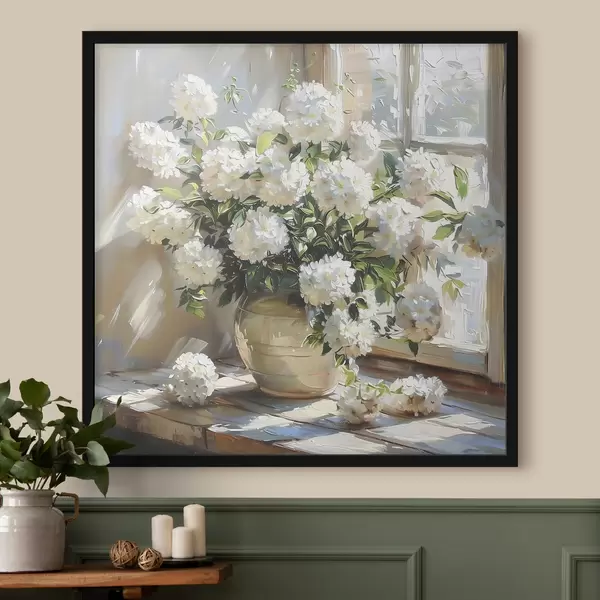 Affiche Hortensias blancs dans le vase, lumière du soleil dans la fenêtre, peinture à l'huile Non f39779
