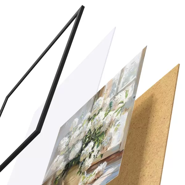 Le poster se compose d'un cadre, d'un plexiglas, d'une image imprimée et d'un support en aggloméré. Le poster peut être immédiatement accroché au mur grâce aux fixations au dos.
