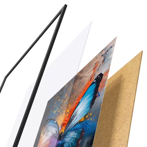 Le poster se compose d'un cadre, d'un plexiglas, d'une image imprimée et d'un support en aggloméré. Le poster peut être immédiatement accroché au mur grâce aux fixations au dos.