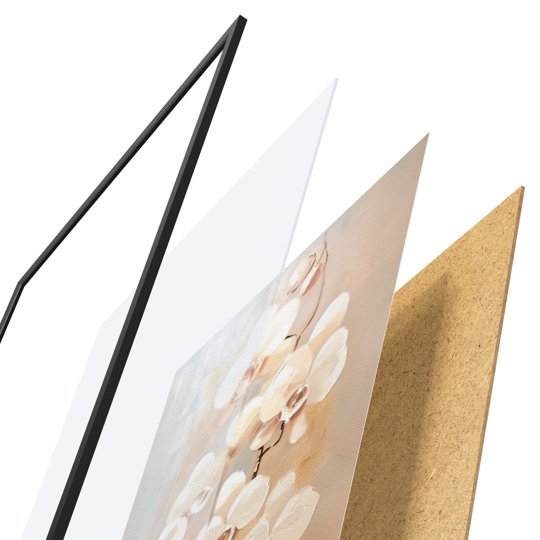 Le poster se compose d'un cadre, d'un plexiglas, d'une image imprimée et d'un support en aggloméré. Le poster peut être immédiatement accroché au mur grâce aux fixations au dos.