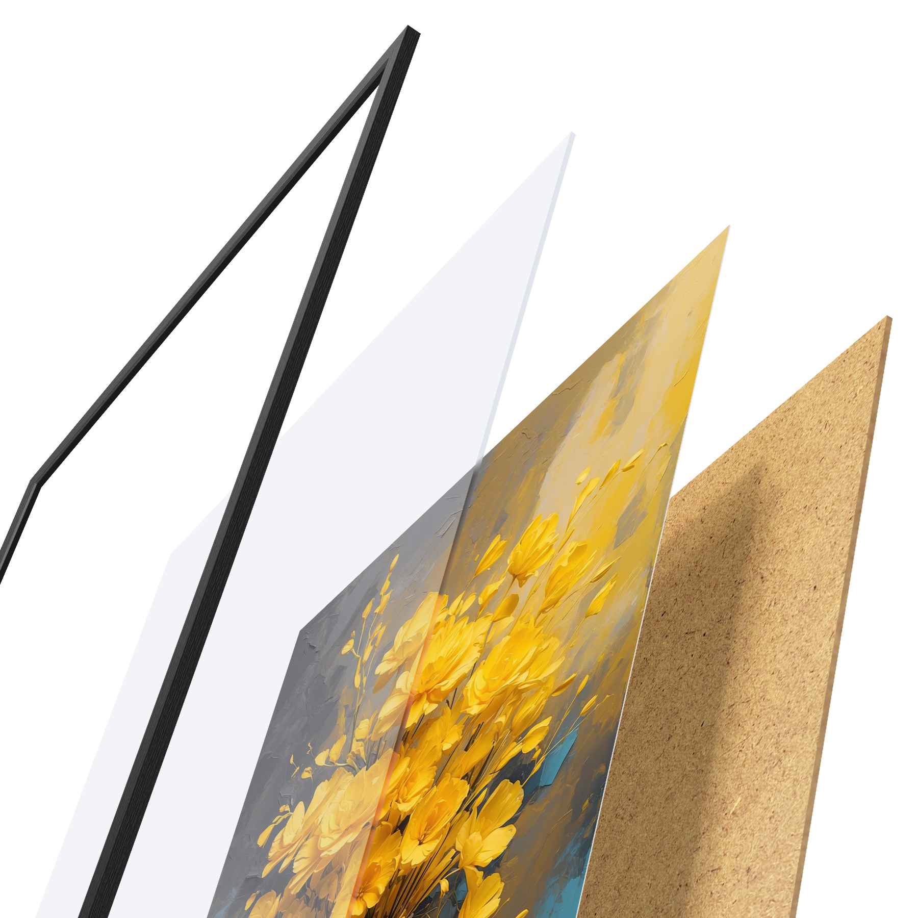 Le poster se compose d'un cadre, d'un plexiglas, d'une image imprimée et d'un support en aggloméré. Le poster peut être immédiatement accroché au mur grâce aux fixations au dos.