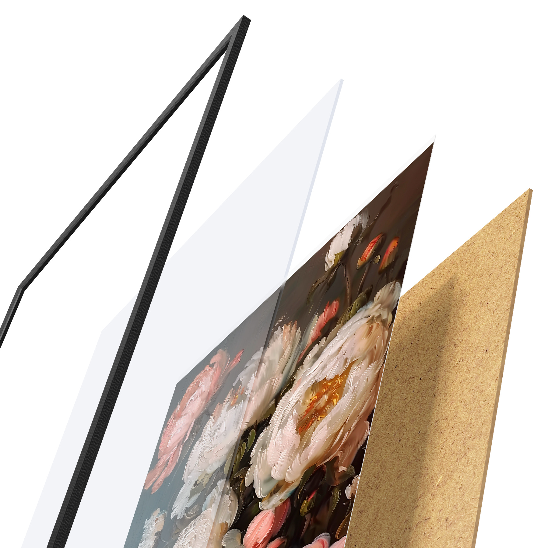Le poster se compose d'un cadre, d'un plexiglas, d'une image imprimée et d'un support en aggloméré. Le poster peut être immédiatement accroché au mur grâce aux fixations au dos.