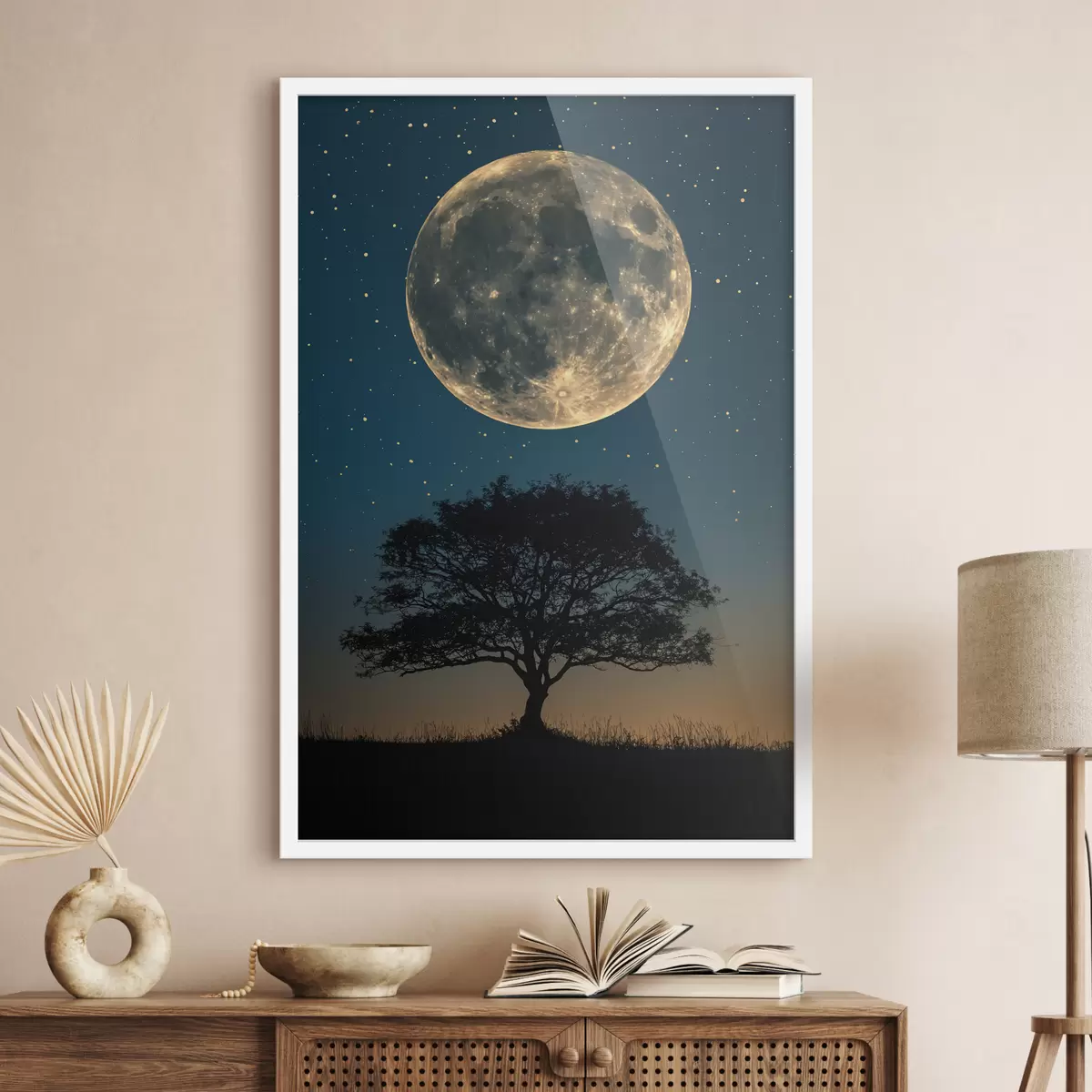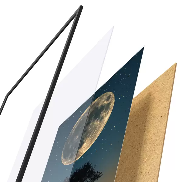Le poster se compose d'un cadre, d'un plexiglas, d'une image imprimée et d'un support en aggloméré. Le poster peut être immédiatement accroché au mur grâce aux fixations au dos.