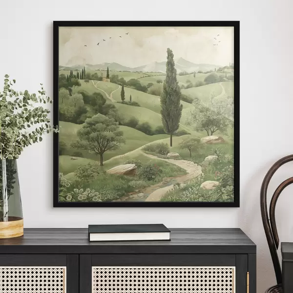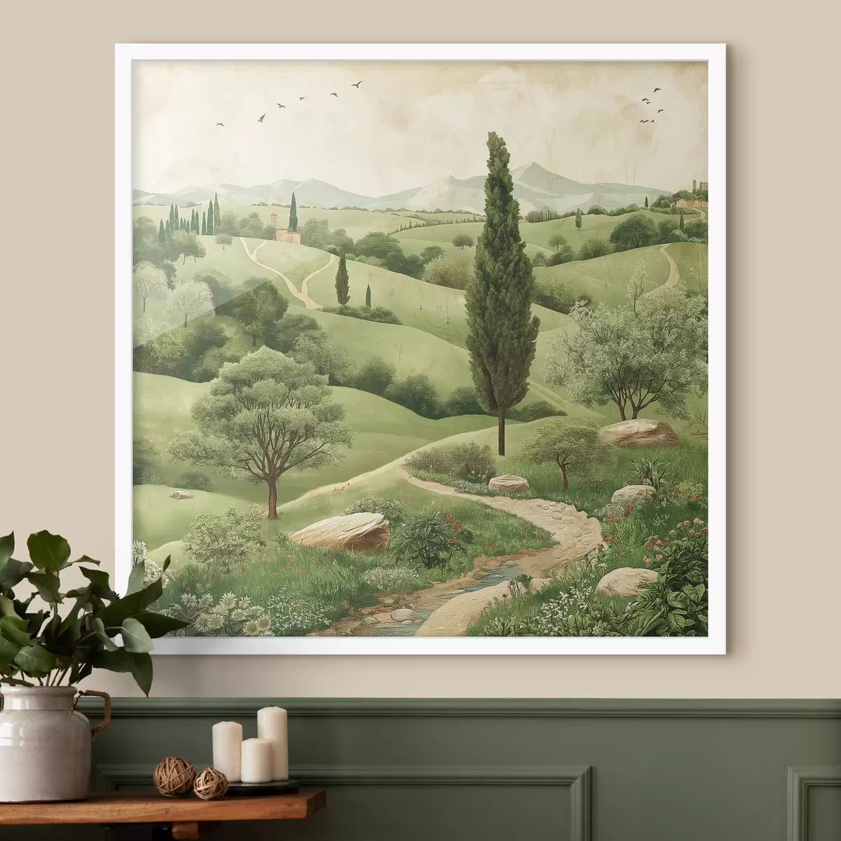 Affiche Paysage de Toscane, style vintage, couleurs vert pastel, collines et arbres Non f40075