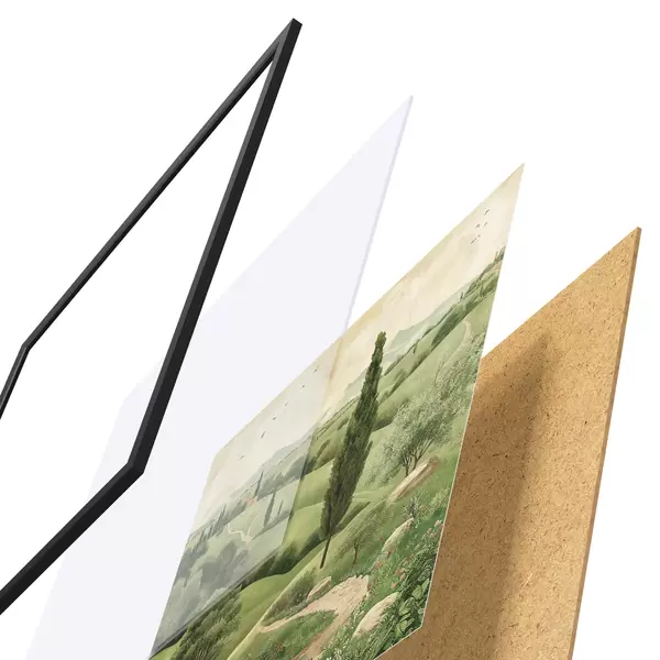 Le poster se compose d'un cadre, d'un plexiglas, d'une image imprimée et d'un support en aggloméré. Le poster peut être immédiatement accroché au mur grâce aux fixations au dos.