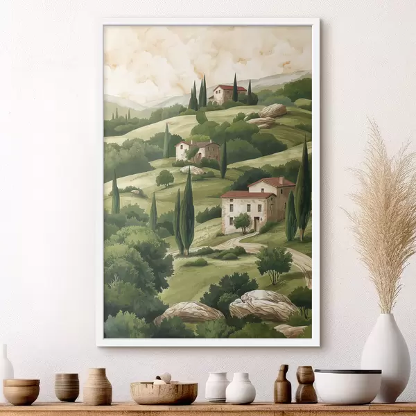 Affiche Paysage avec maisons anciennes, couleurs vert pastel, dessin acrylique, rustique Non f40080