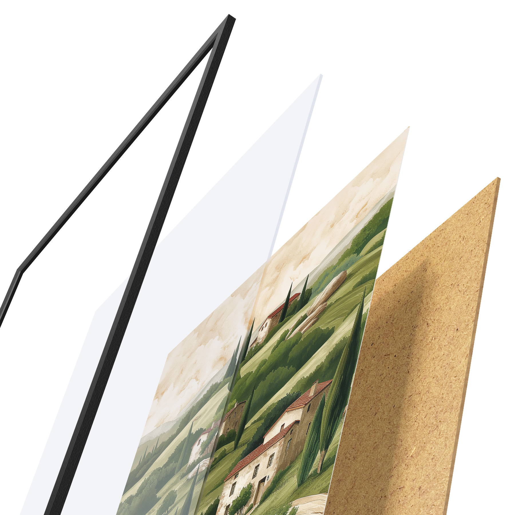 Le poster se compose d'un cadre, d'un plexiglas, d'une image imprimée et d'un support en aggloméré. Le poster peut être immédiatement accroché au mur grâce aux fixations au dos.