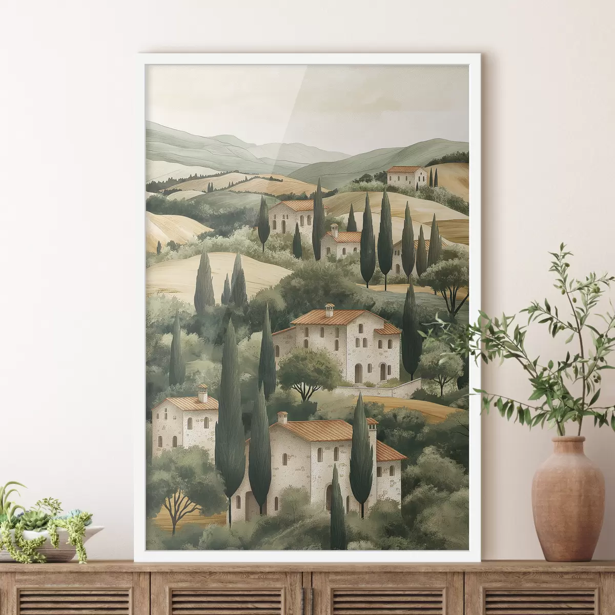 Affiche Paysage toscan avec maisons anciennes, couleurs pastel, collines et arbres, rustique Non f40082
