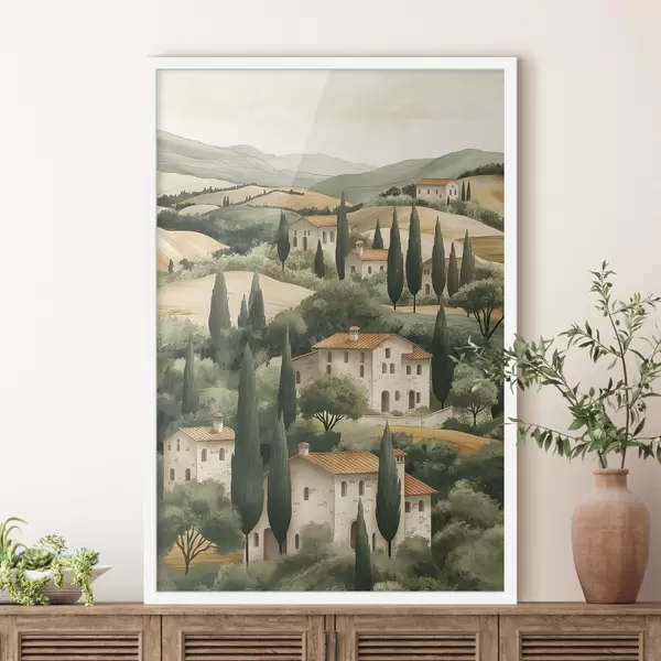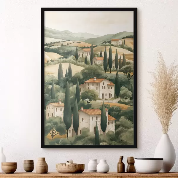 Affiche Paysage toscan avec maisons anciennes, couleurs pastel, collines et arbres, rustique f40082