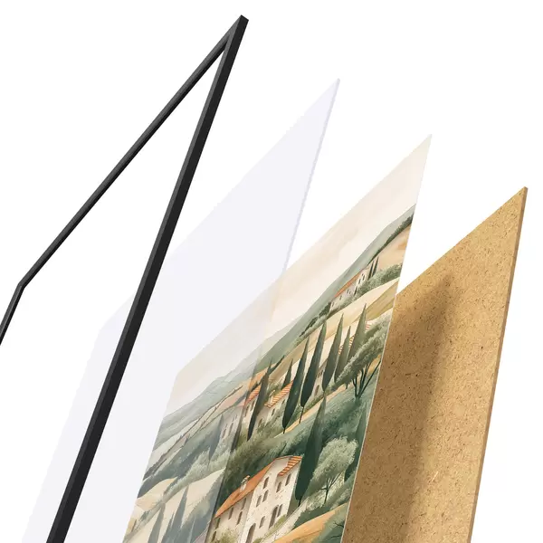 Le poster se compose d'un cadre, d'un plexiglas, d'une image imprimée et d'un support en aggloméré. Le poster peut être immédiatement accroché au mur grâce aux fixations au dos.