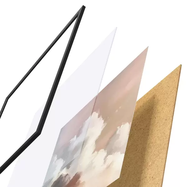 Le poster se compose d'un cadre, d'un plexiglas, d'une image imprimée et d'un support en aggloméré. Le poster peut être immédiatement accroché au mur grâce aux fixations au dos.