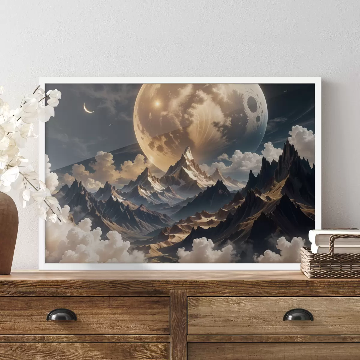 Affiche Un paysage surréaliste avec des montagnes enneigées sous une pleine lune massive, avec des nuages filamenteux f40147