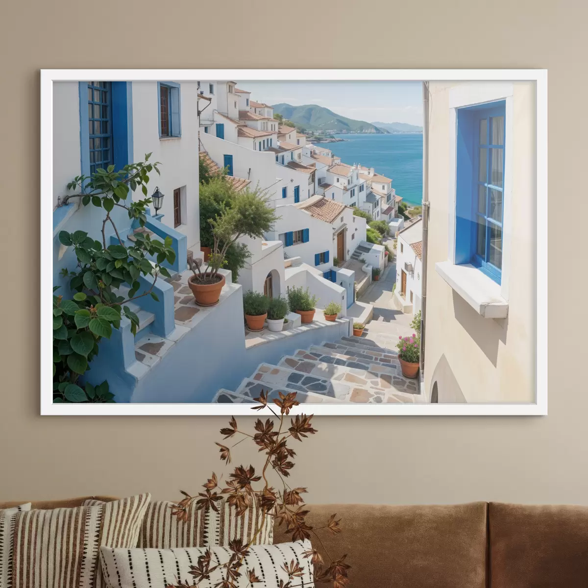 Affiche Une ville côtière pittoresque avec des bâtiments blancs, des fenêtres bleues et des plantes en pot bordant les rues étroites Non f40148