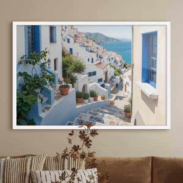 Affiche Une ville côtière pittoresque avec des bâtiments blancs, des fenêtres bleues et des plantes en pot bordant les rues étroites f40148