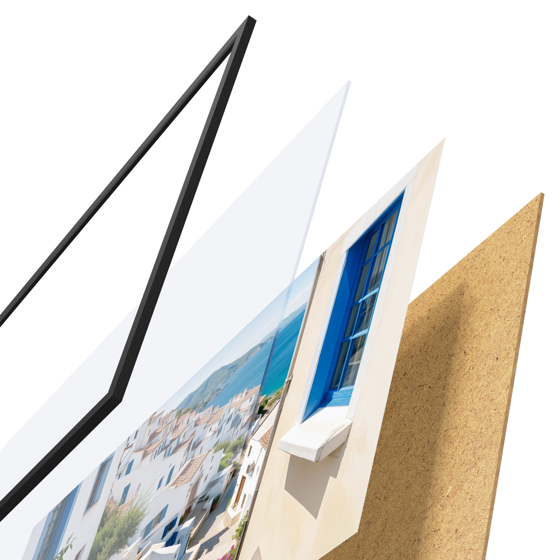 Le poster se compose d'un cadre, d'un plexiglas, d'une image imprimée et d'un support en aggloméré. Le poster peut être immédiatement accroché au mur grâce aux fixations au dos.