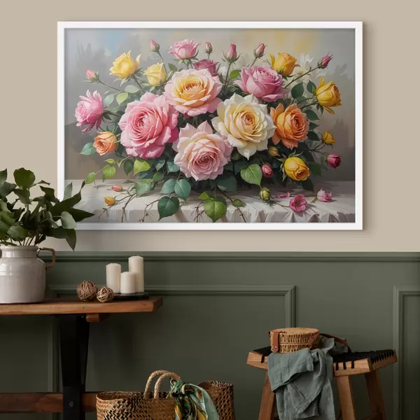 Affiche Un bouquet de roses colorées dans différentes nuances de rose, de jaune et d'orange, disposé avec des feuilles vertes f40149