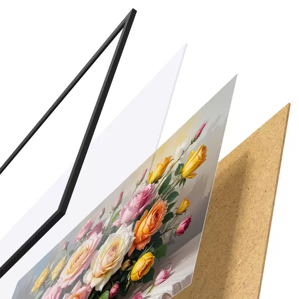 Le poster se compose d'un cadre, d'un plexiglas, d'une image imprimée et d'un support en aggloméré. Le poster peut être immédiatement accroché au mur grâce aux fixations au dos.