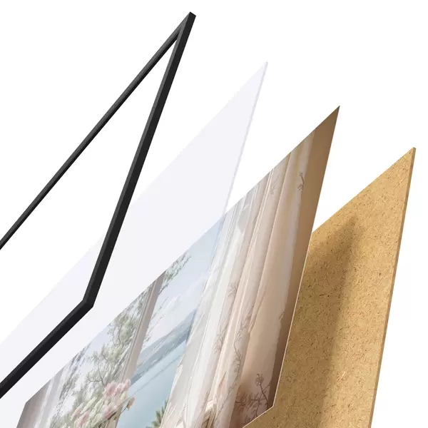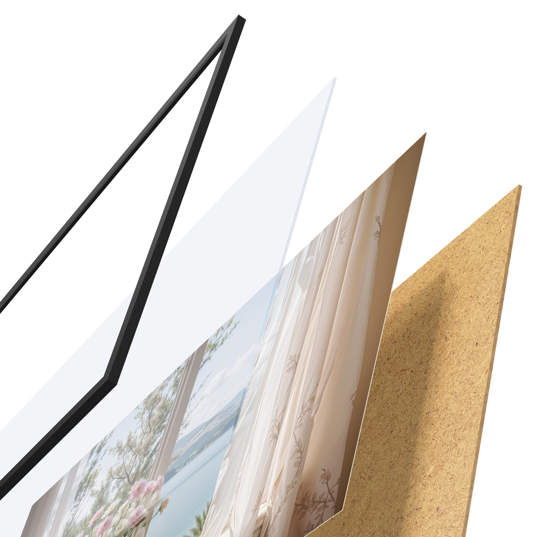 Le poster se compose d'un cadre, d'un plexiglas, d'une image imprimée et d'un support en aggloméré. Le poster peut être immédiatement accroché au mur grâce aux fixations au dos.