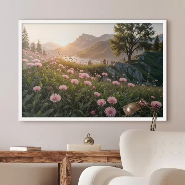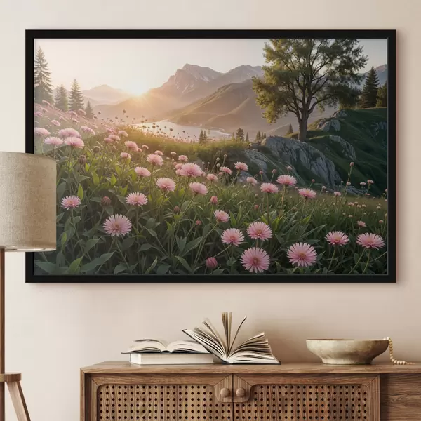 Affiche Un champ de fleurs roses ressemblant à des marguerites au premier plan, avec une grande chaîne de montagnes en arrière-plan Non f40154