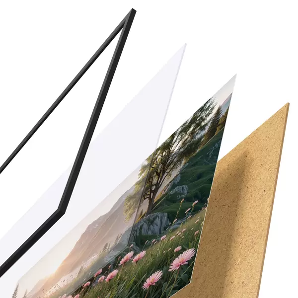 Le poster se compose d'un cadre, d'un plexiglas, d'une image imprimée et d'un support en aggloméré. Le poster peut être immédiatement accroché au mur grâce aux fixations au dos.