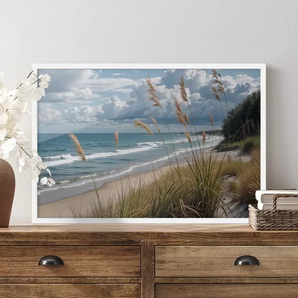 Affiche Une plage pittoresque avec de hautes herbes se balançant dans le vent, surplombant l'océan avec des vagues déferlantes et un ciel nuageux f40161