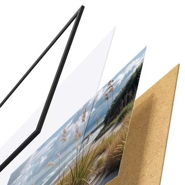 Le poster se compose d'un cadre, d'un plexiglas, d'une image imprimée et d'un support en aggloméré. Le poster peut être immédiatement accroché au mur grâce aux fixations au dos.