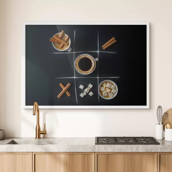 Affiche Une tasse de café avec des bâtons de cannelle, des morceaux de sucre et des guimauves disposés dans une grille de morpion Non f40163