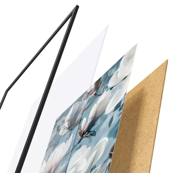 Le poster se compose d'un cadre, d'un plexiglas, d'une image imprimée et d'un support en aggloméré. Le poster peut être immédiatement accroché au mur grâce aux fixations au dos.