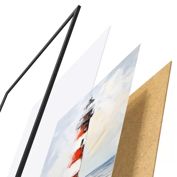 Le poster se compose d'un cadre, d'un plexiglas, d'une image imprimée et d'un support en aggloméré. Le poster peut être immédiatement accroché au mur grâce aux fixations au dos.