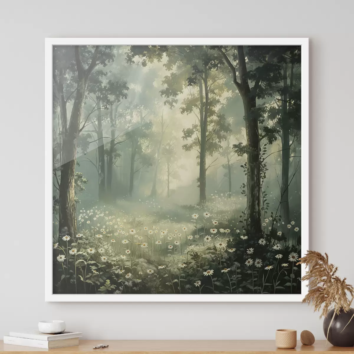 Affiche Forêt avec une douce lumière du soleil, fleurs de camomille, arbres, herbe verte, dessin acrylique Non f40228
