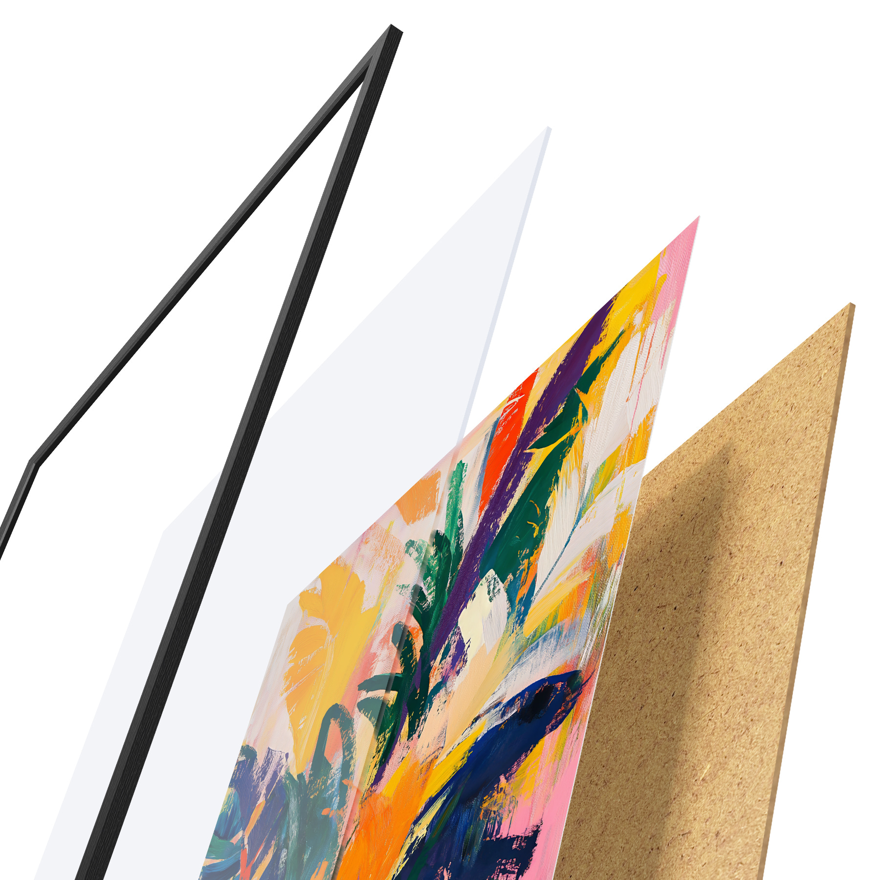 Le poster se compose d'un cadre, d'un plexiglas, d'une image imprimée et d'un support en aggloméré. Le poster peut être immédiatement accroché au mur grâce aux fixations au dos.