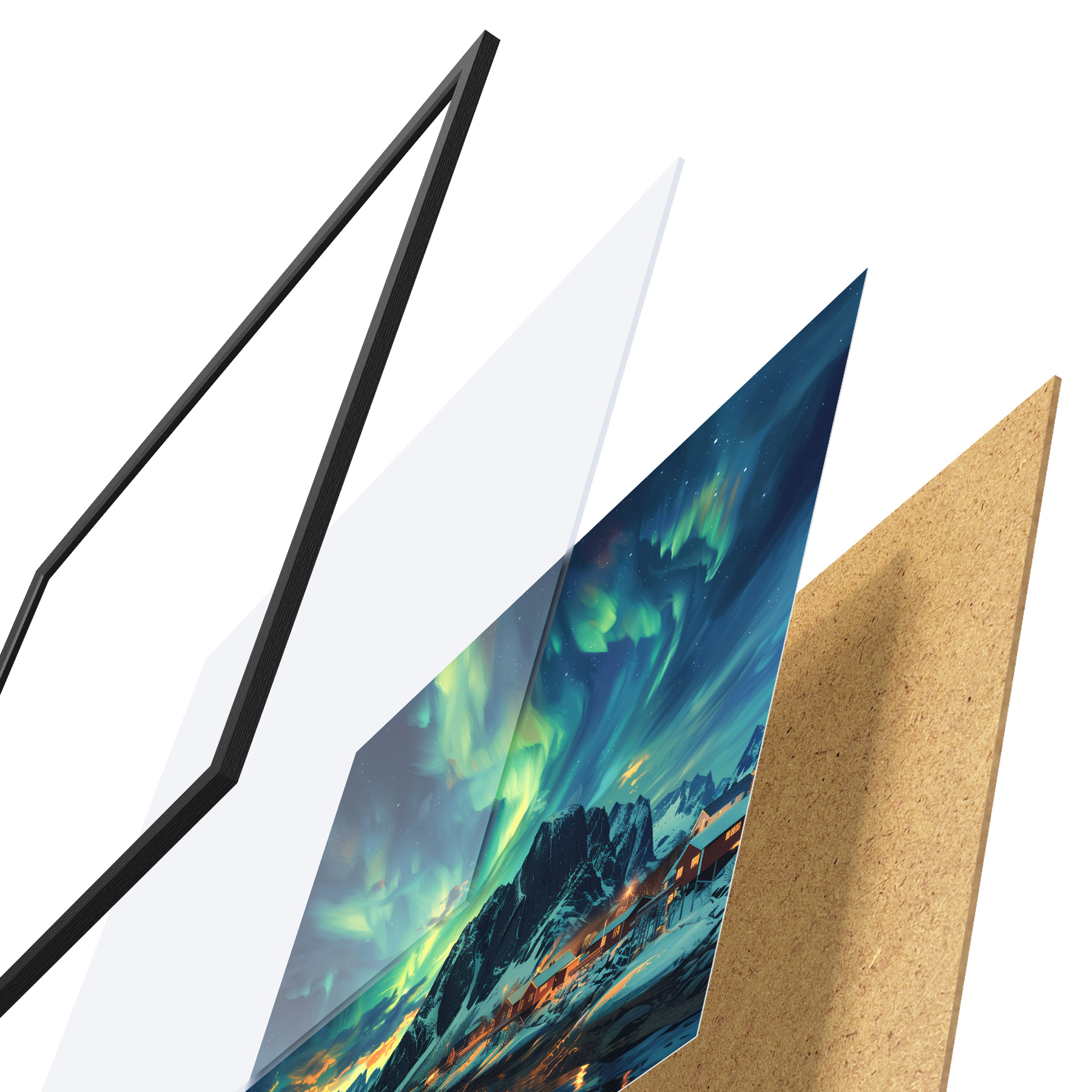 Le poster se compose d'un cadre, d'un plexiglas, d'une image imprimée et d'un support en aggloméré. Le poster peut être immédiatement accroché au mur grâce aux fixations au dos.