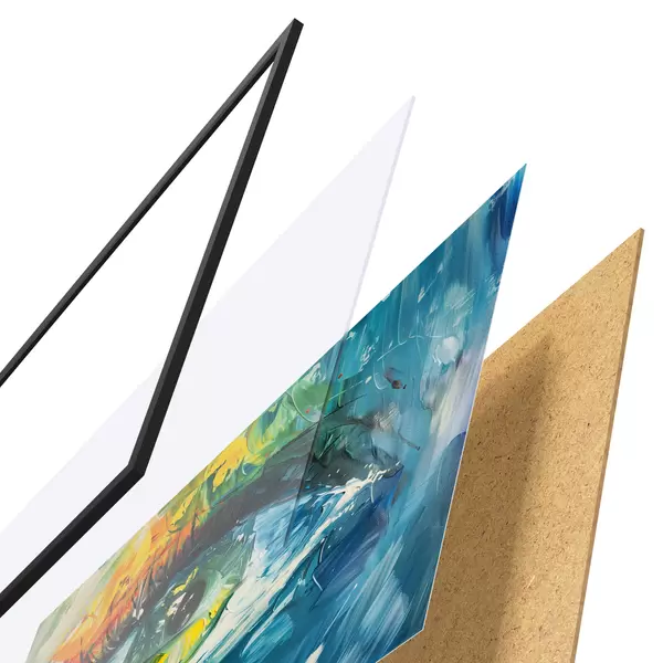 Le poster se compose d'un cadre, d'un plexiglas, d'une image imprimée et d'un support en aggloméré. Le poster peut être immédiatement accroché au mur grâce aux fixations au dos.
