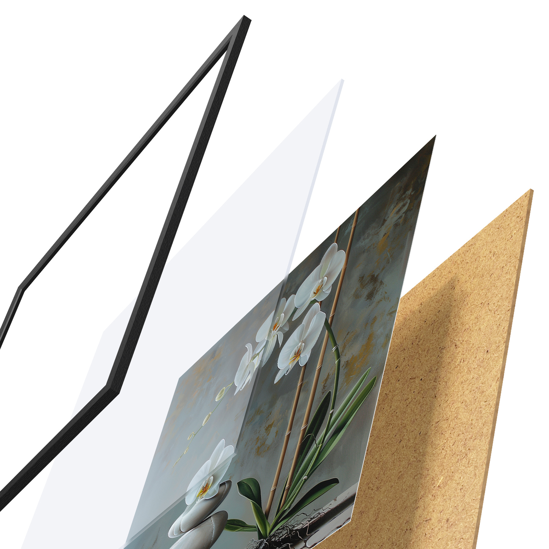 Le poster se compose d'un cadre, d'un plexiglas, d'une image imprimée et d'un support en aggloméré. Le poster peut être immédiatement accroché au mur grâce aux fixations au dos.